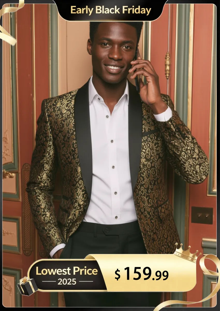 Men's 2-Piece Gold Jacquard Embroidery Paisley Black Tuxedo