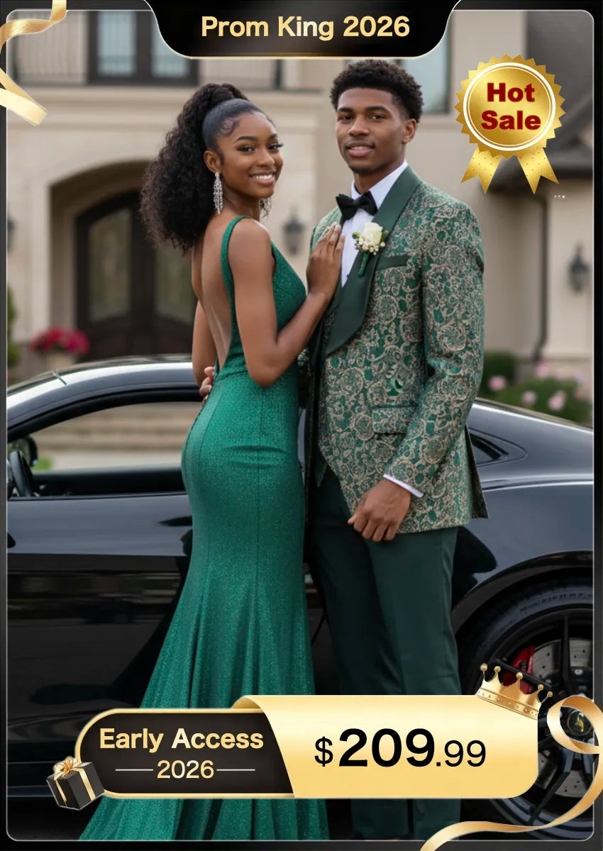 Men's 3-Piece Vintage Style Gold Damask Jacquard Green Tuxedo