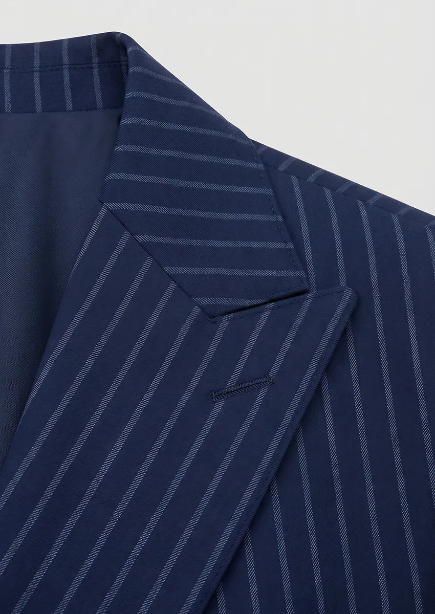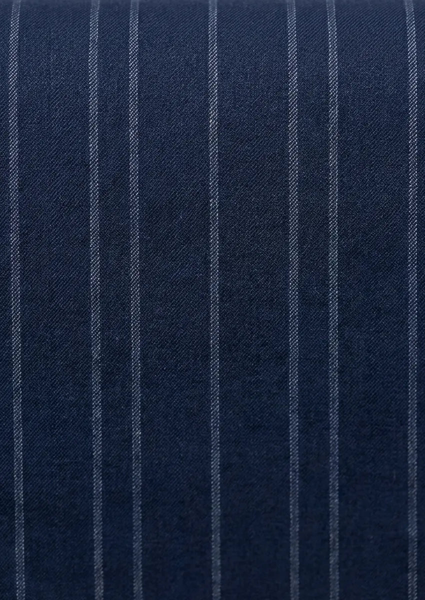 Whether you're aiming for a powerful boardroom presence or a memorable wedding look, this striped navy suit provides versatility and style. Pair it with a crisp white shirt and polished dress shoes for a classic look, or add a patterned tie and pocket square for a personalized touch. Invest in timeless sophistication with our men's 3-piece striped navy suit and make a lasting impression.