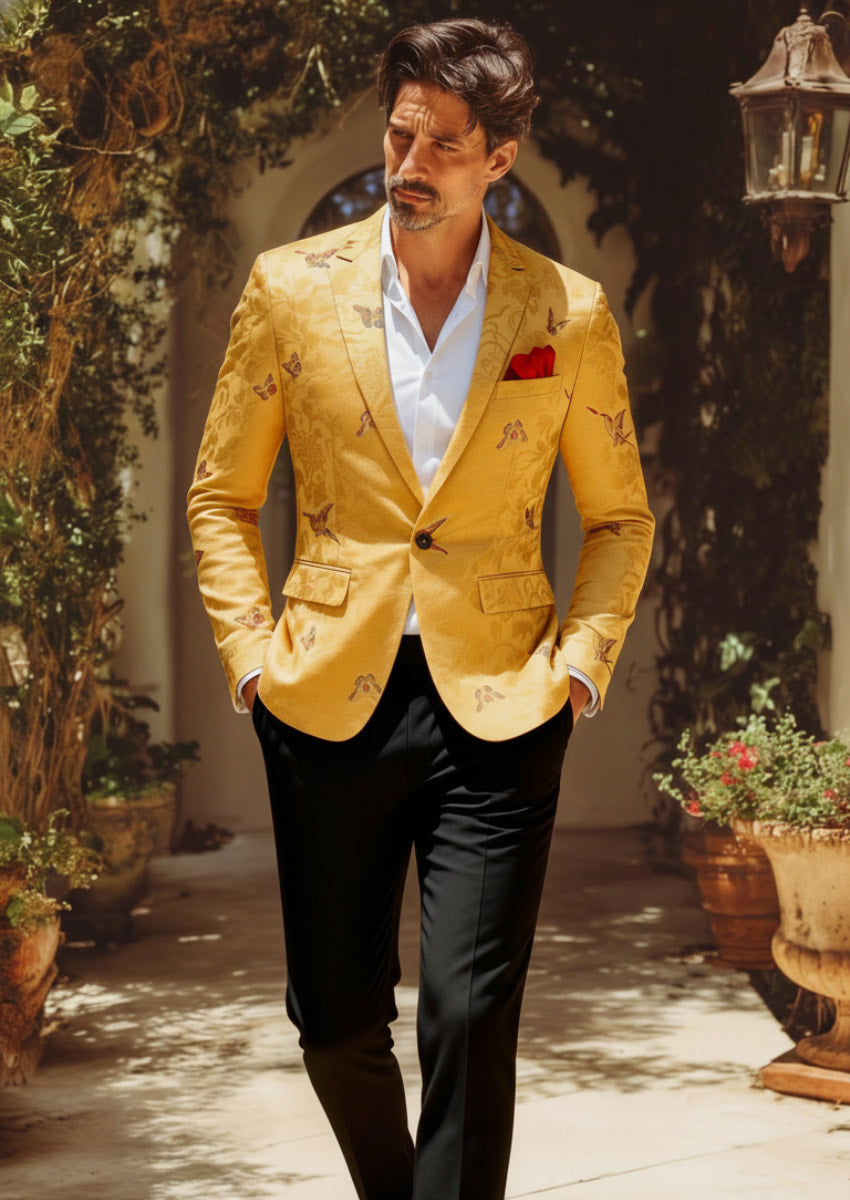 Men’s Yellow Butterfly Jacquard One-Button Slim Fit Blazer