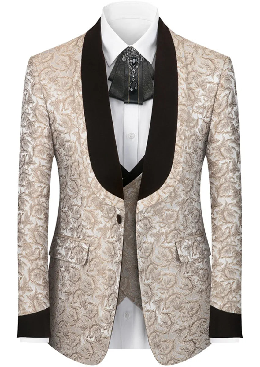 Men's 3-Piece Shawl Collar Leaf Jacquard Beige Tuxedo Set