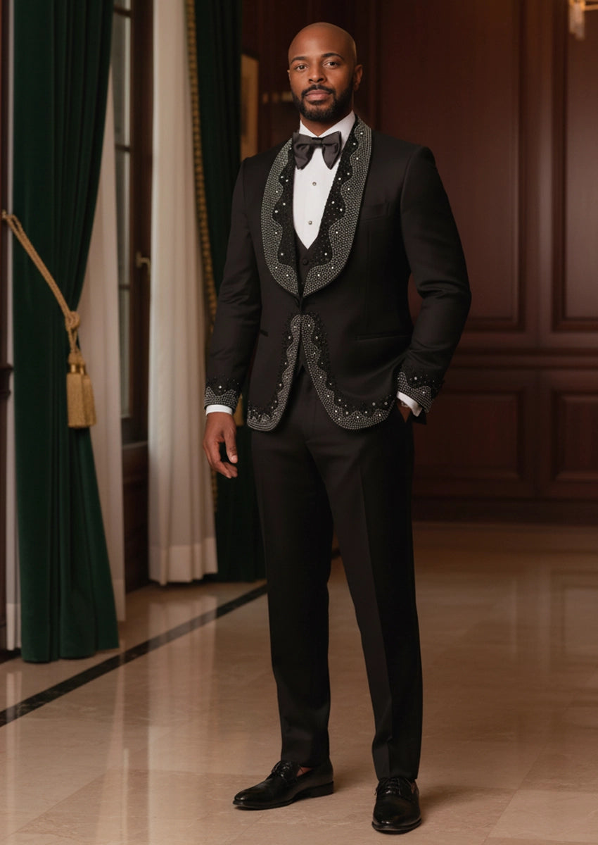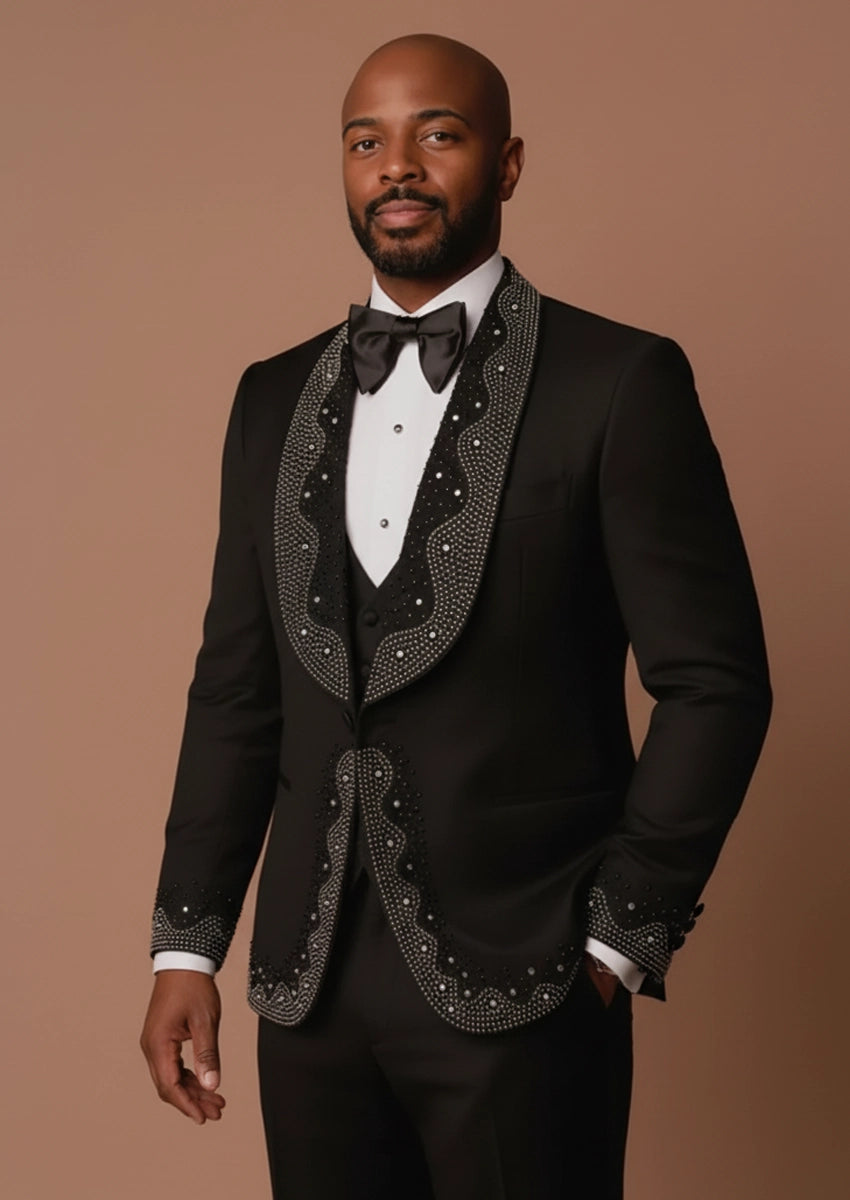 Men's Rhinestone Embellishments 3-Piece Wedding Black Tuxedo