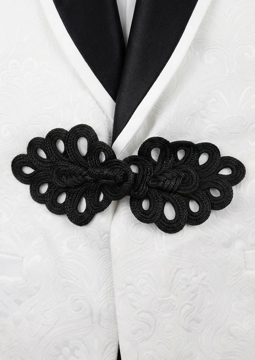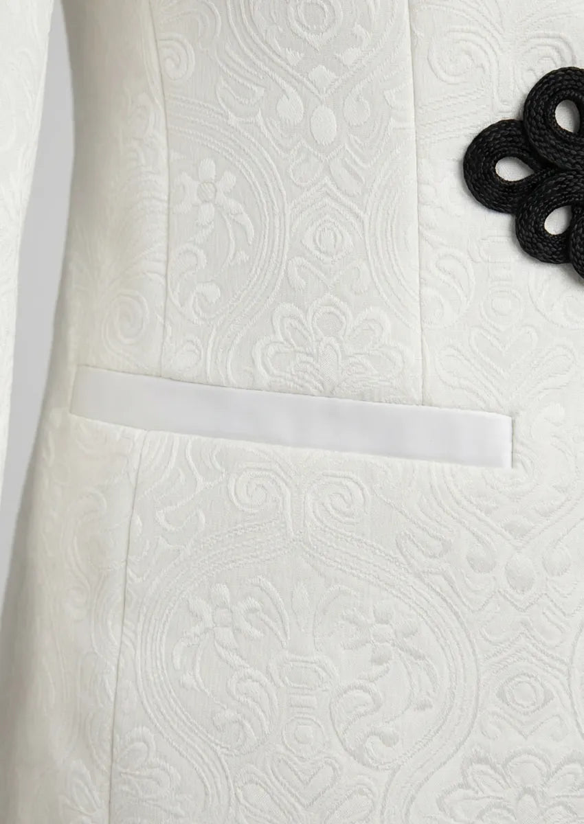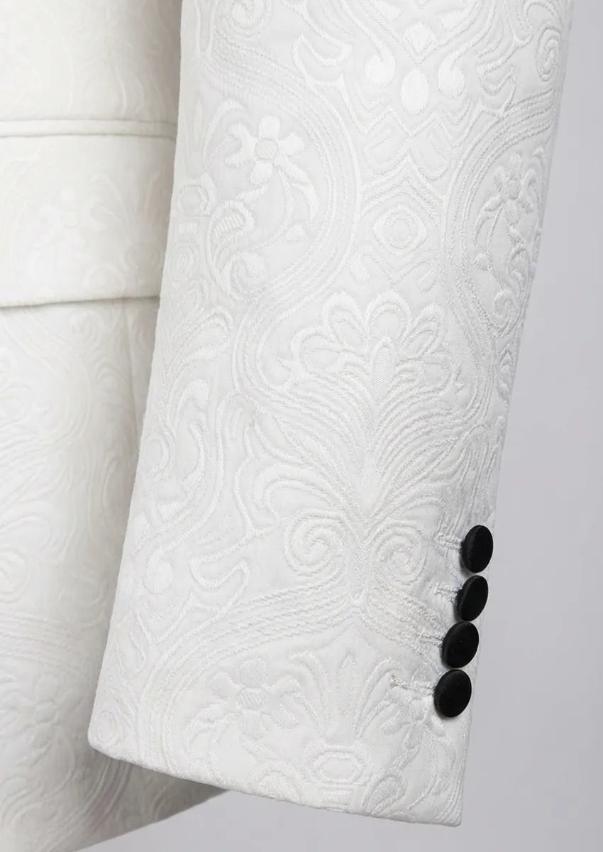 Esmoquin blanco de 3 piezas con solapa negra y estampado floral de jacquard para hombre