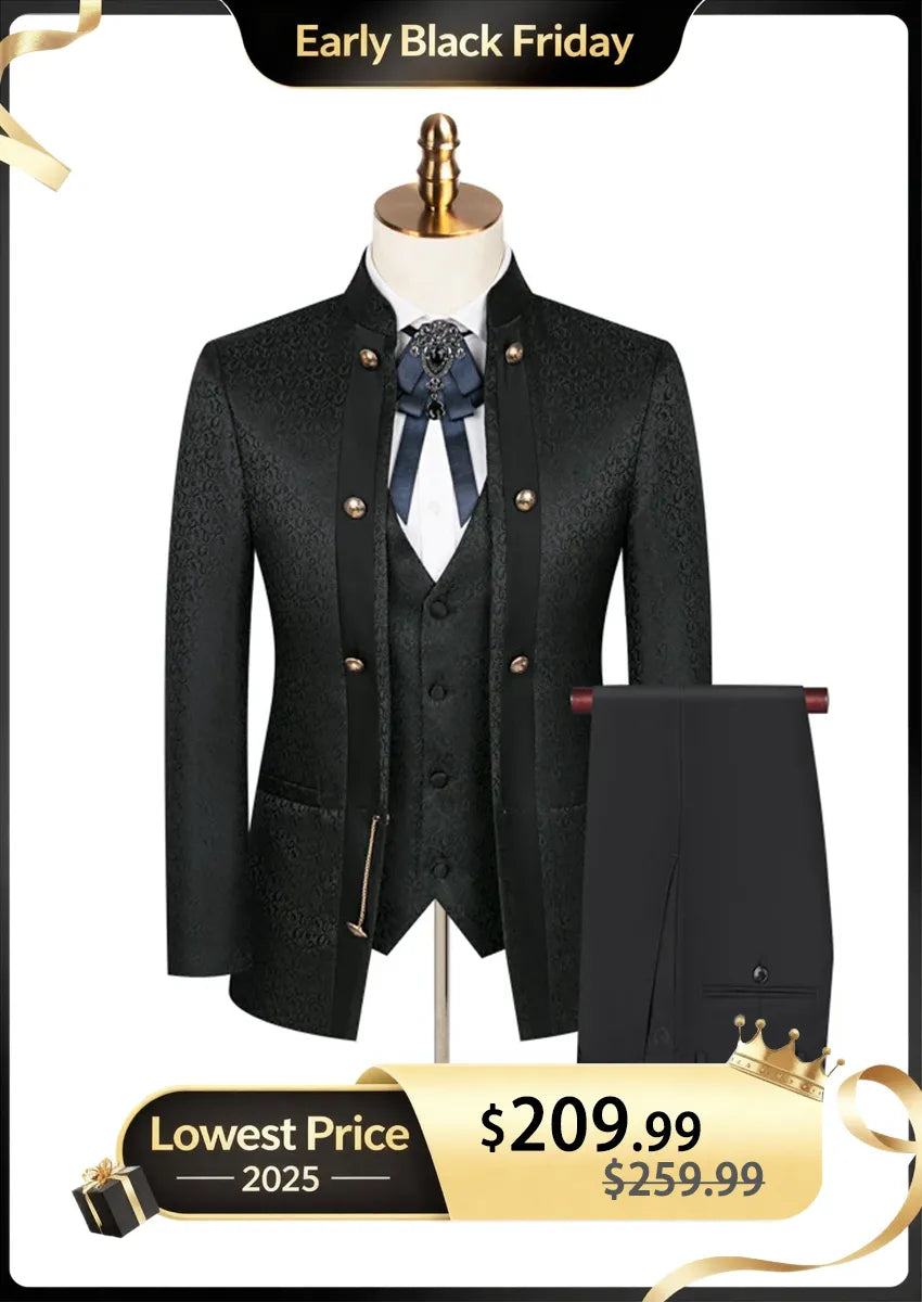 Traje de fiesta de 3 piezas con cuello tradicional y estampado paisley negro para hombre