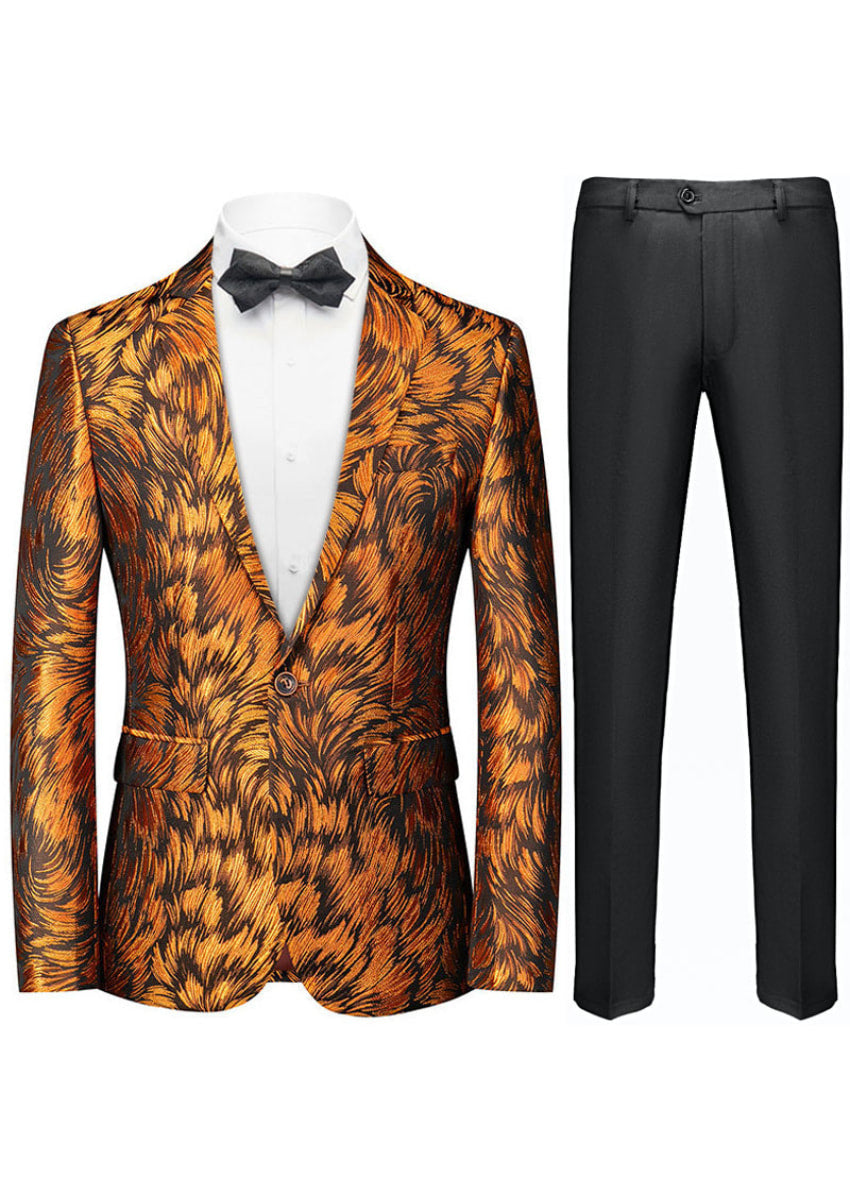 Chaqueta de esmoquin negra con estampado de plumas naranjas y jacquard para hombre