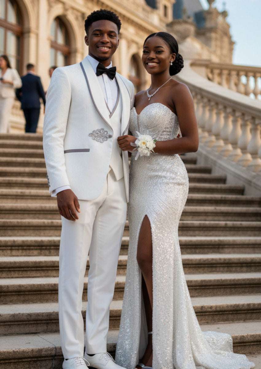 Esmoquin blanco de tres piezas con solapa chal y estampado floral de jacquard para hombre