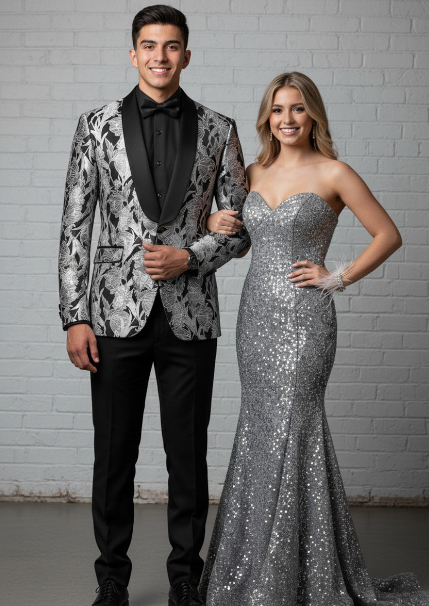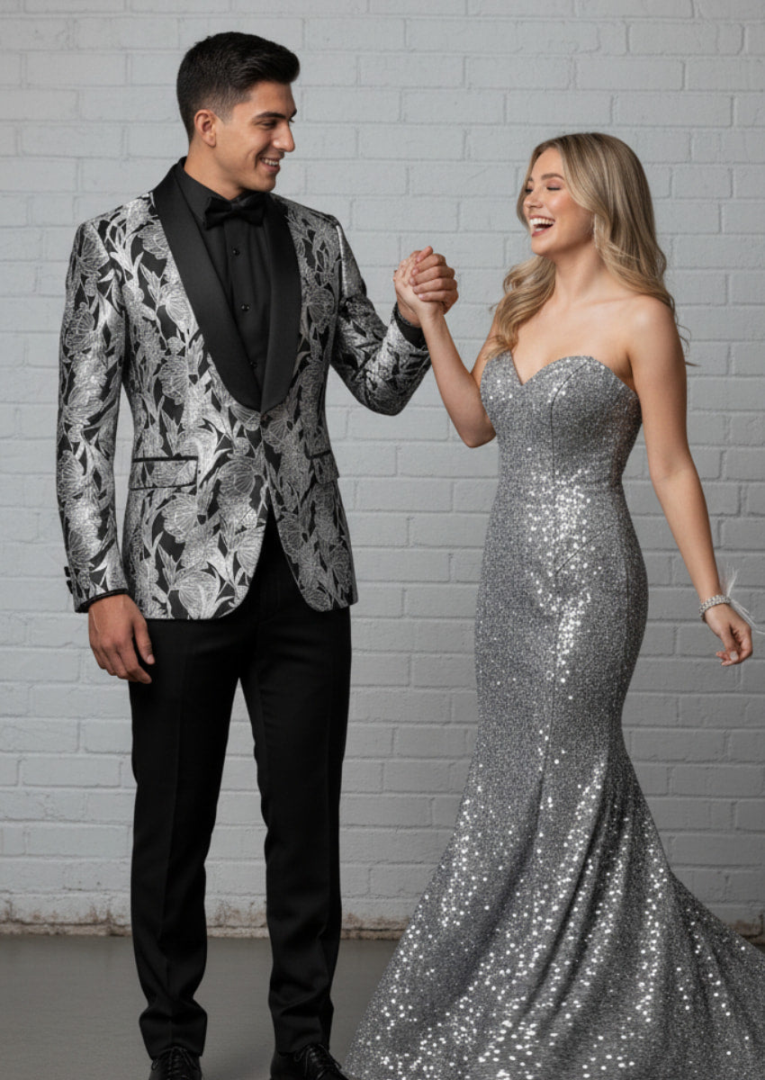 Ideal para bodas, galas y momentos de alfombra roja, este esmoquin negro de jacquard plateado combina perfectamente con camisas de vestir clásicas, pajaritas o accesorios modernos para una impresión segura e inolvidable.