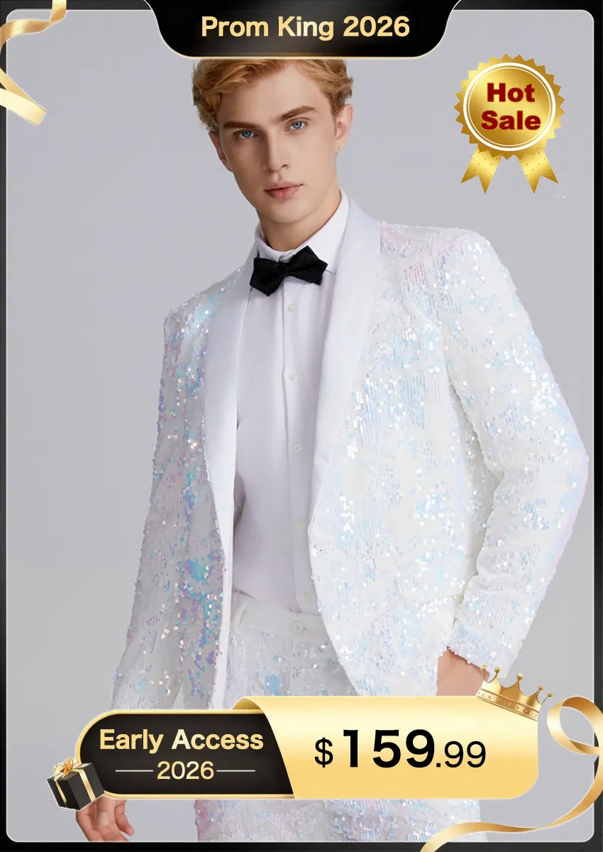 Esmoquin de dos piezas para hombre con solapa chal en satén azul y lentejuelas blancas