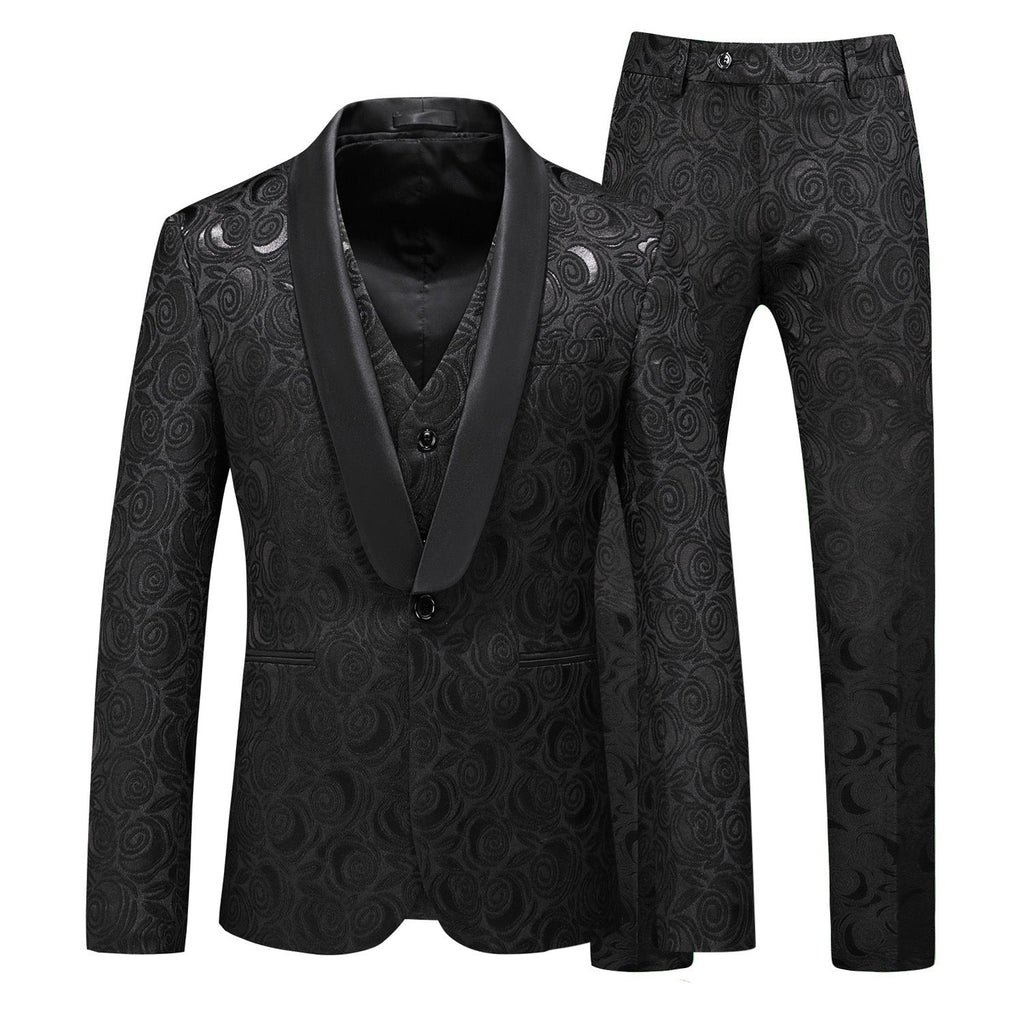Traje de boda de 3 piezas con solapa chal y bordado de rosas negras para hombre