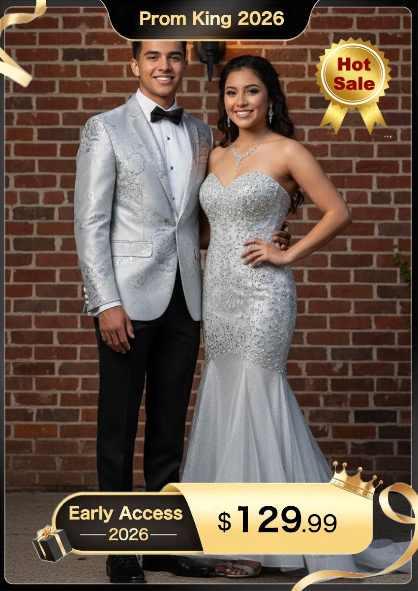 Esmoquin plateado de jacquard con solapa de pico y un botón para hombre