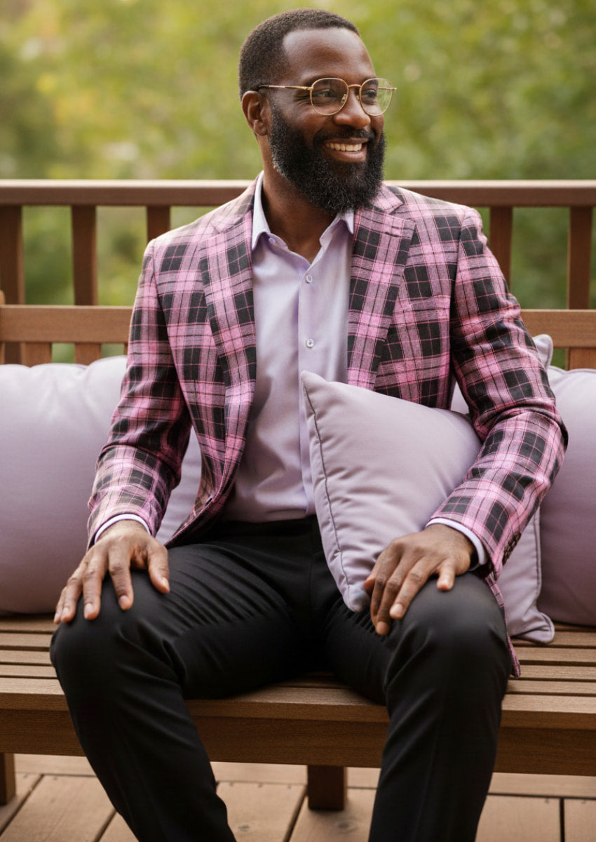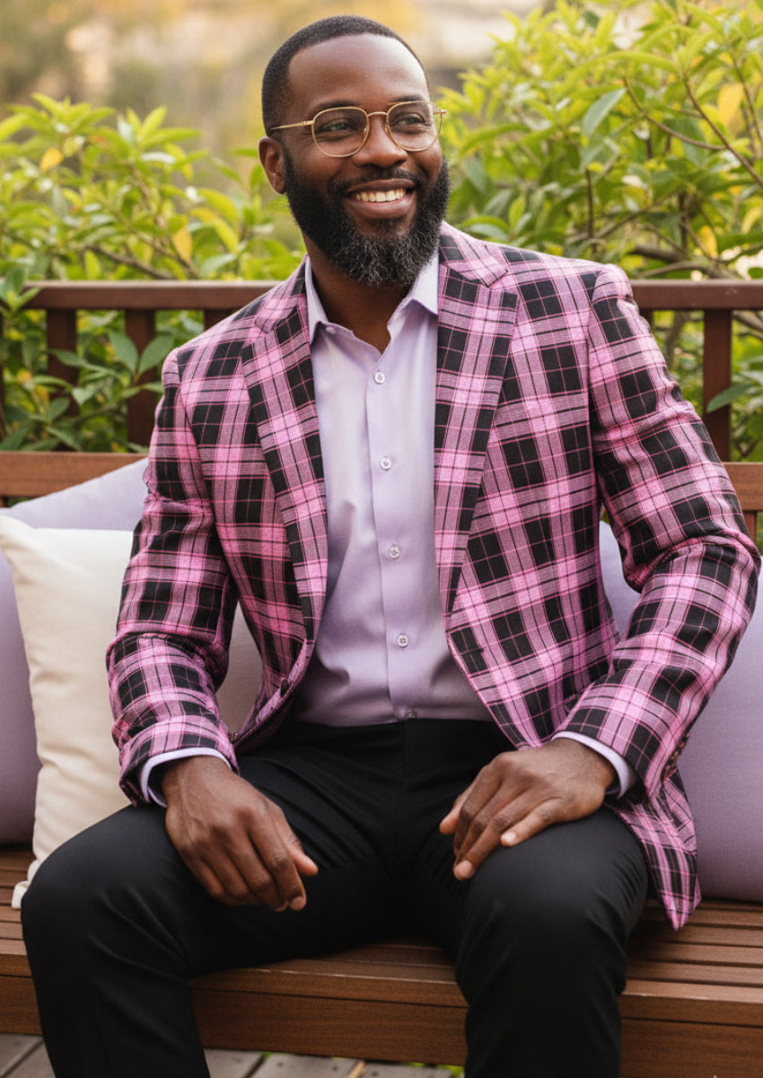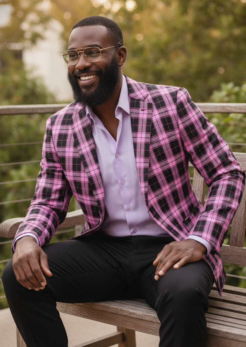 Para un estilo atemporal, combina este traje a cuadros morado y negro con una camisa blanca; si lo prefieres, prueba una camisa más oscura para realzar los ricos tonos del traje. Para un look verdaderamente elegante, completa tu atuendo con una corbata o pañuelo de bolsillo a juego y zapatos de vestir impecables. Disfruta de la especial combinación de comodidad y estilo que ofrece este traje entallado y sal con la seguridad de lucir espectacular.