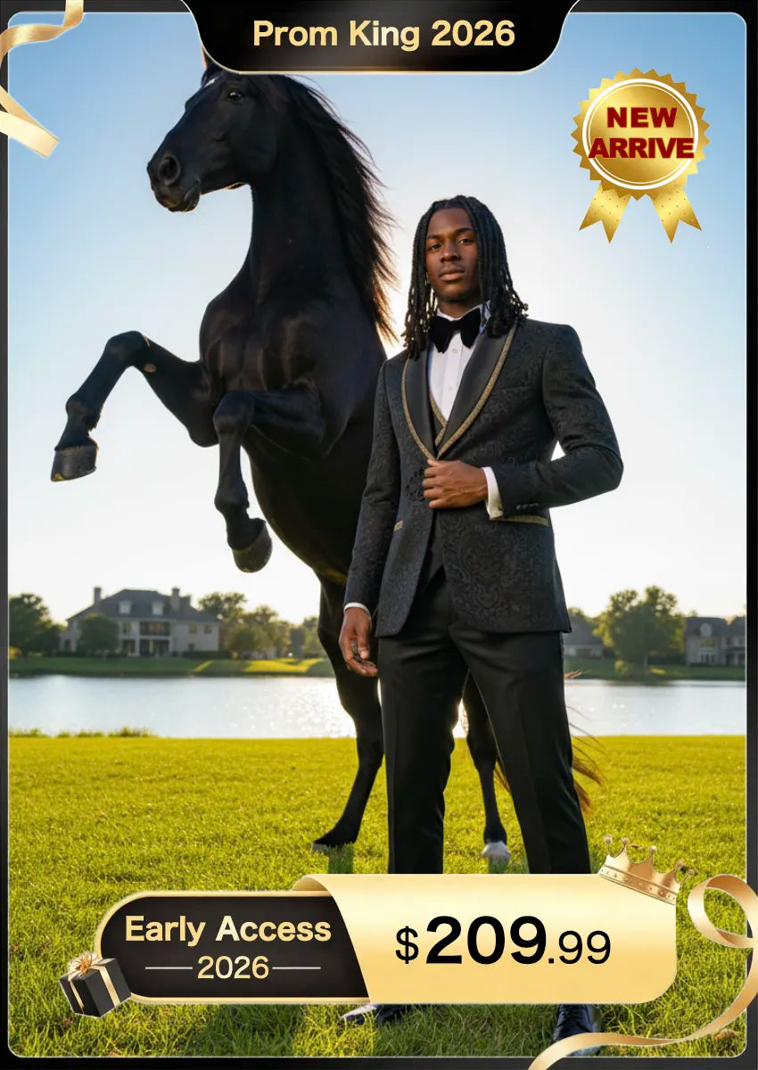 Esmoquin negro de tres piezas con estampado floral y solapa chal para hombre