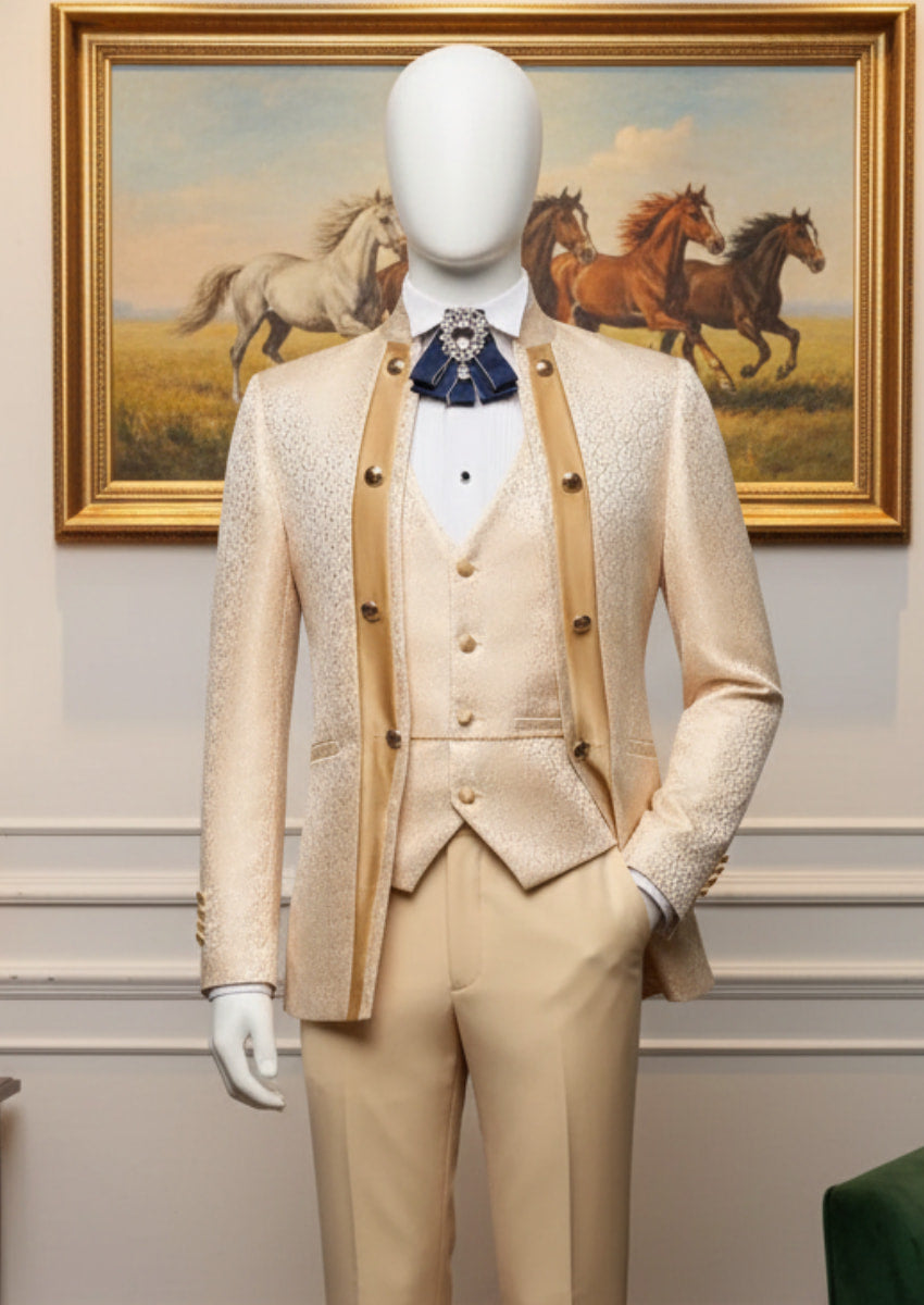 Traje de fiesta entallado de 3 piezas con cuello tradicional y estampado paisley color champán para hombre