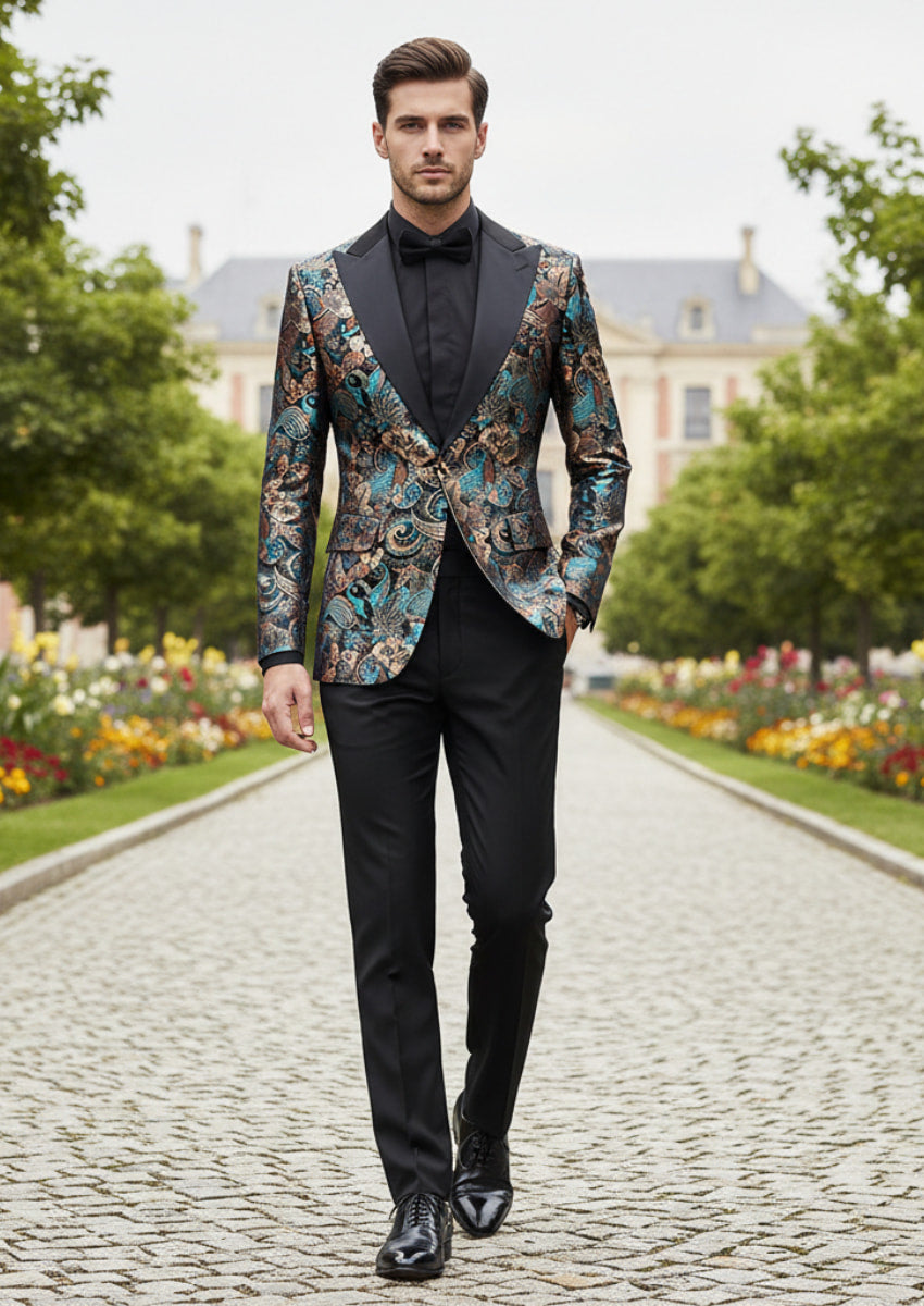Smoking homme en jacquard botanique à revers pointu bleu sarcelle foncé