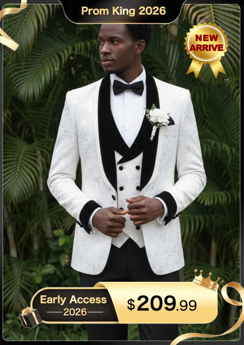 Men's 3-Piece Shawl Collar Leaf Jacquard White Tuxedo Set