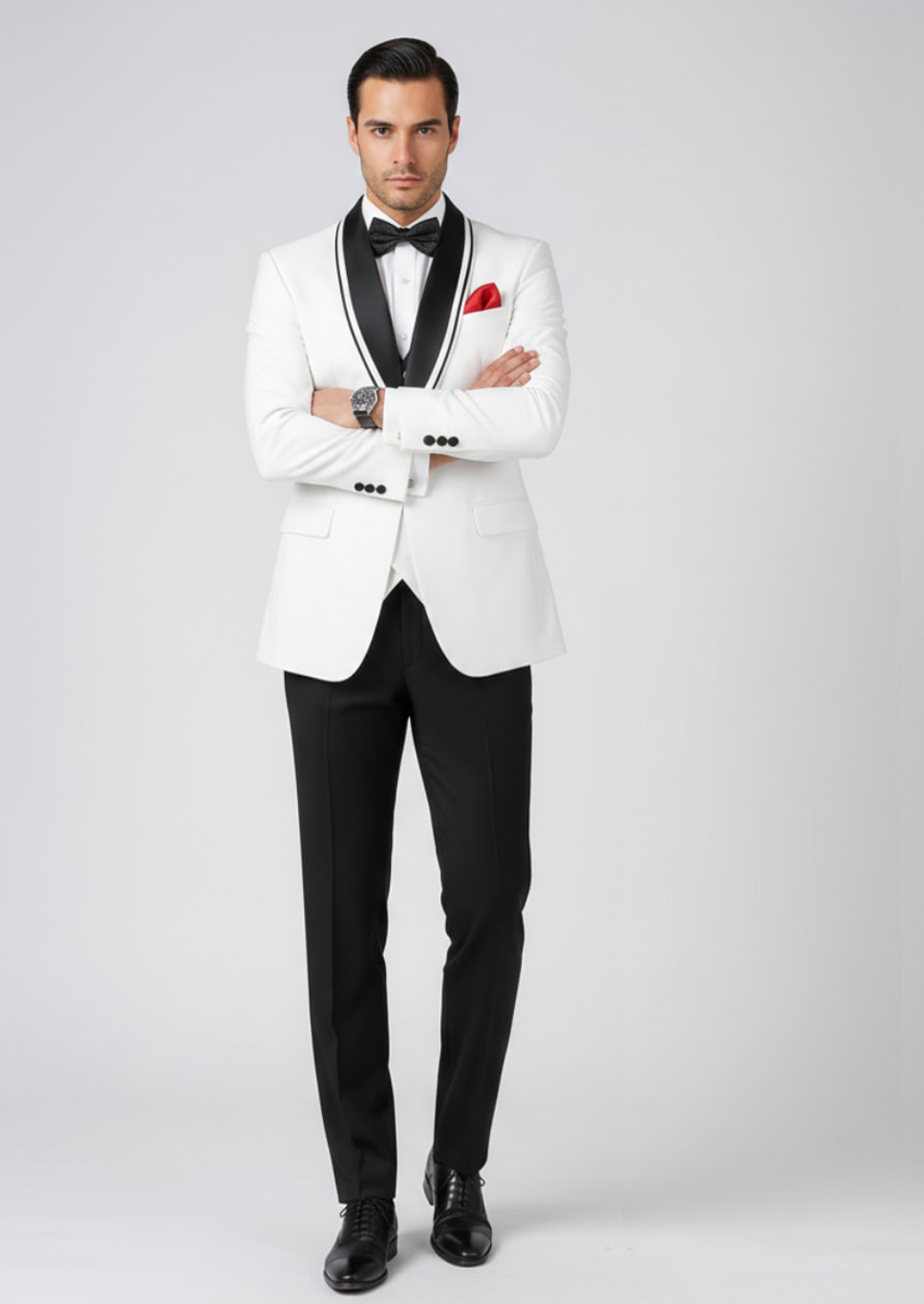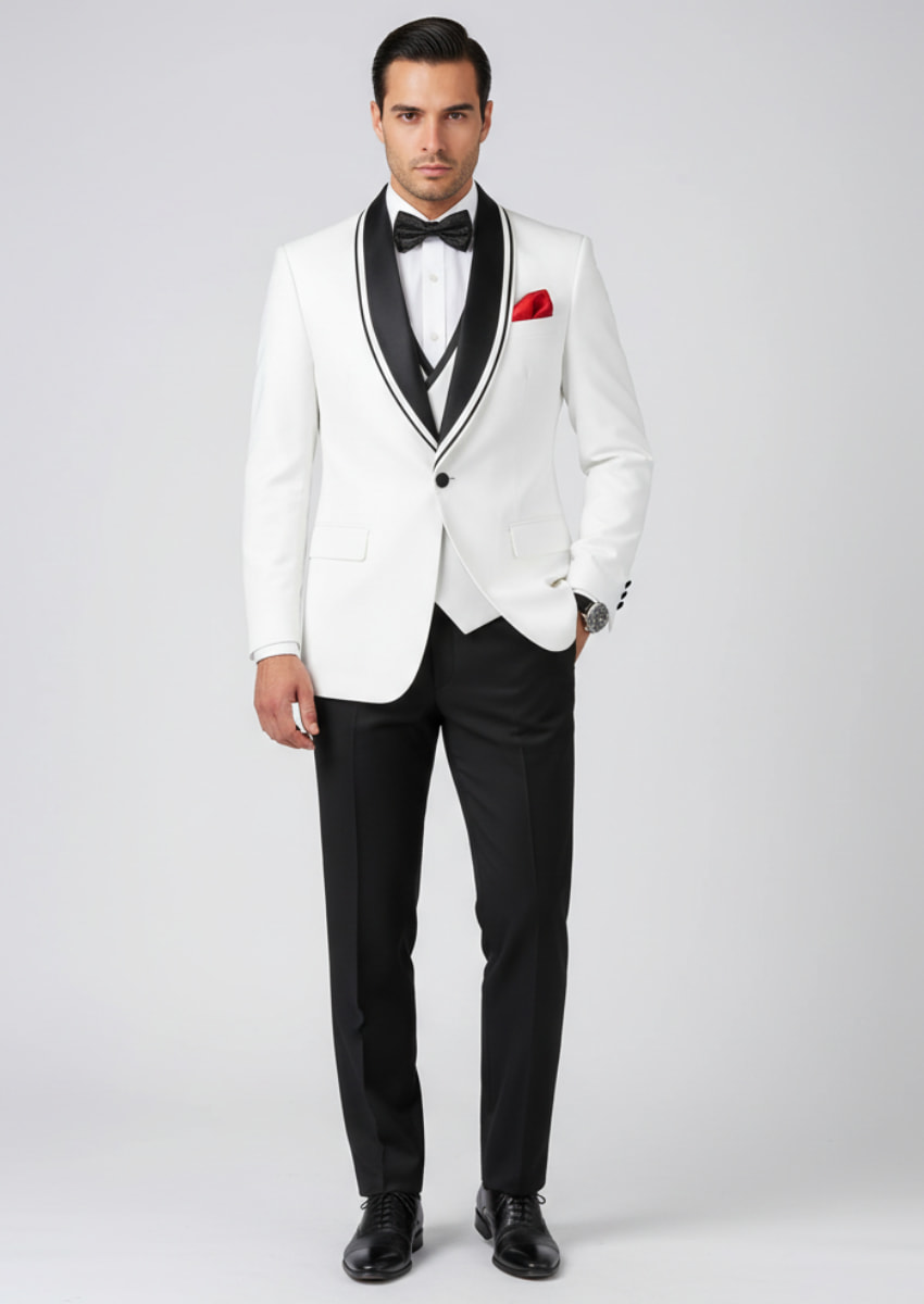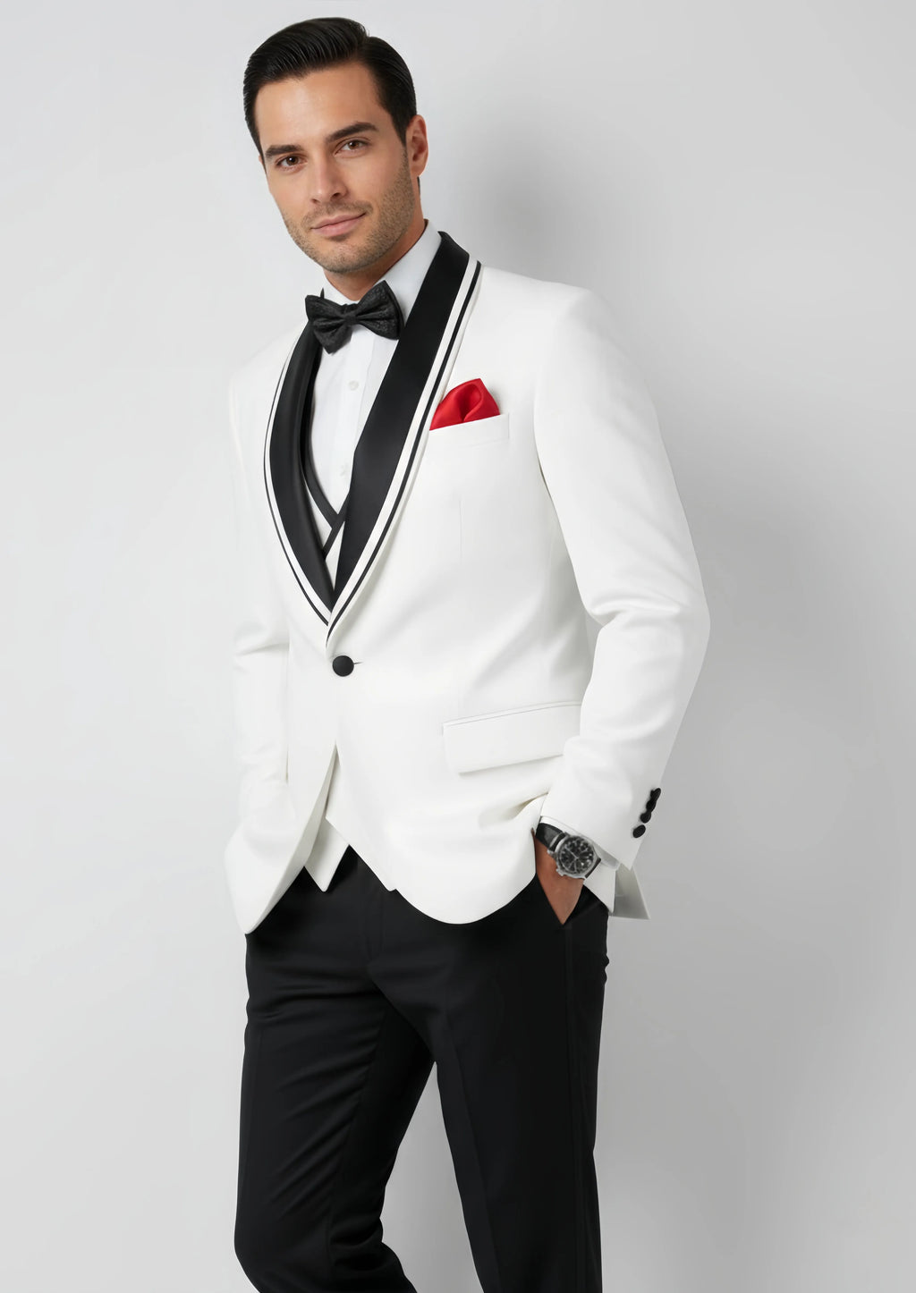 Smoking 3 pièces pour homme, un bouton, revers noir et blanc