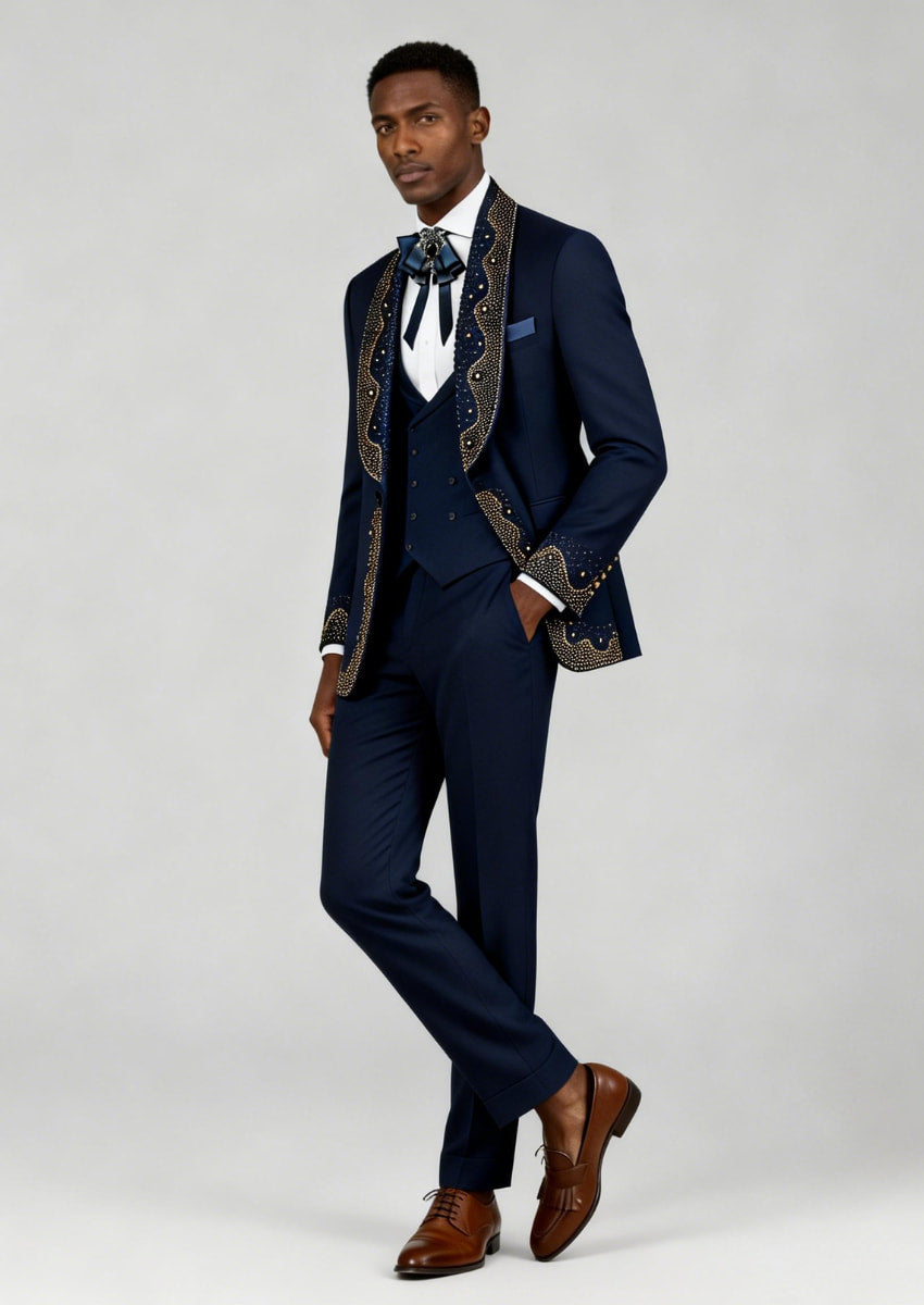 Smoking de mariage bleu foncé 3 pièces pour homme avec strass