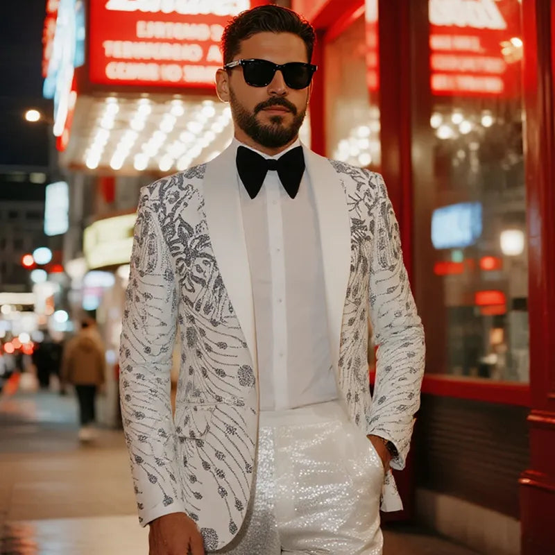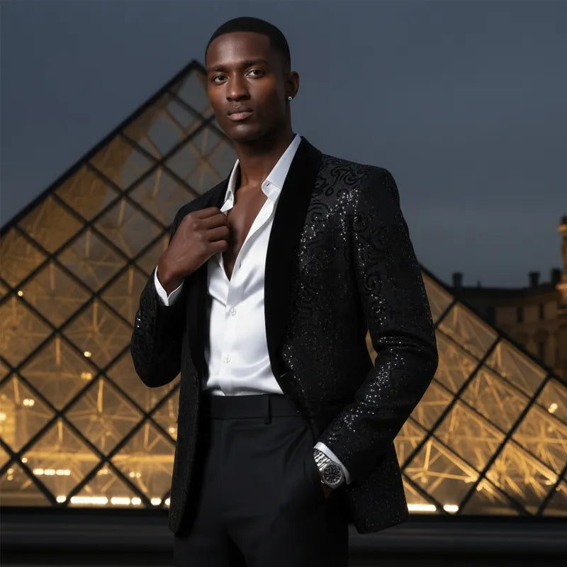 À la tombée de la nuit, la véritable splendeur n'a pas besoin d'être ostentatoire. Nous avons repensé les costumes noirs à paillettes, permettant aux hommes de passer en toute fluidité de l'ambiance intime d'une cérémonie de mariage à l'atmosphère vibrante d'une boîte de nuit. Sous la douce lumière d'une église, il respire l'élégance discrète, tandis que sous les lumières scintillantes de la piste de danse, notre costume noir à paillettes rayonne d'un éclat stellaire. Que ce soit pour les moments solennels d'un mariage dans un manoir, l'énergie spontanée d'un bar ou la grandeur d'une représentation sur scène, ce costume à paillettes équilibre magistralement son éclat pour refléter à la fois fierté culturelle et style personnel. Plus qu'une simple tenue, c'est une déclaration d'individualité et de sophistication.